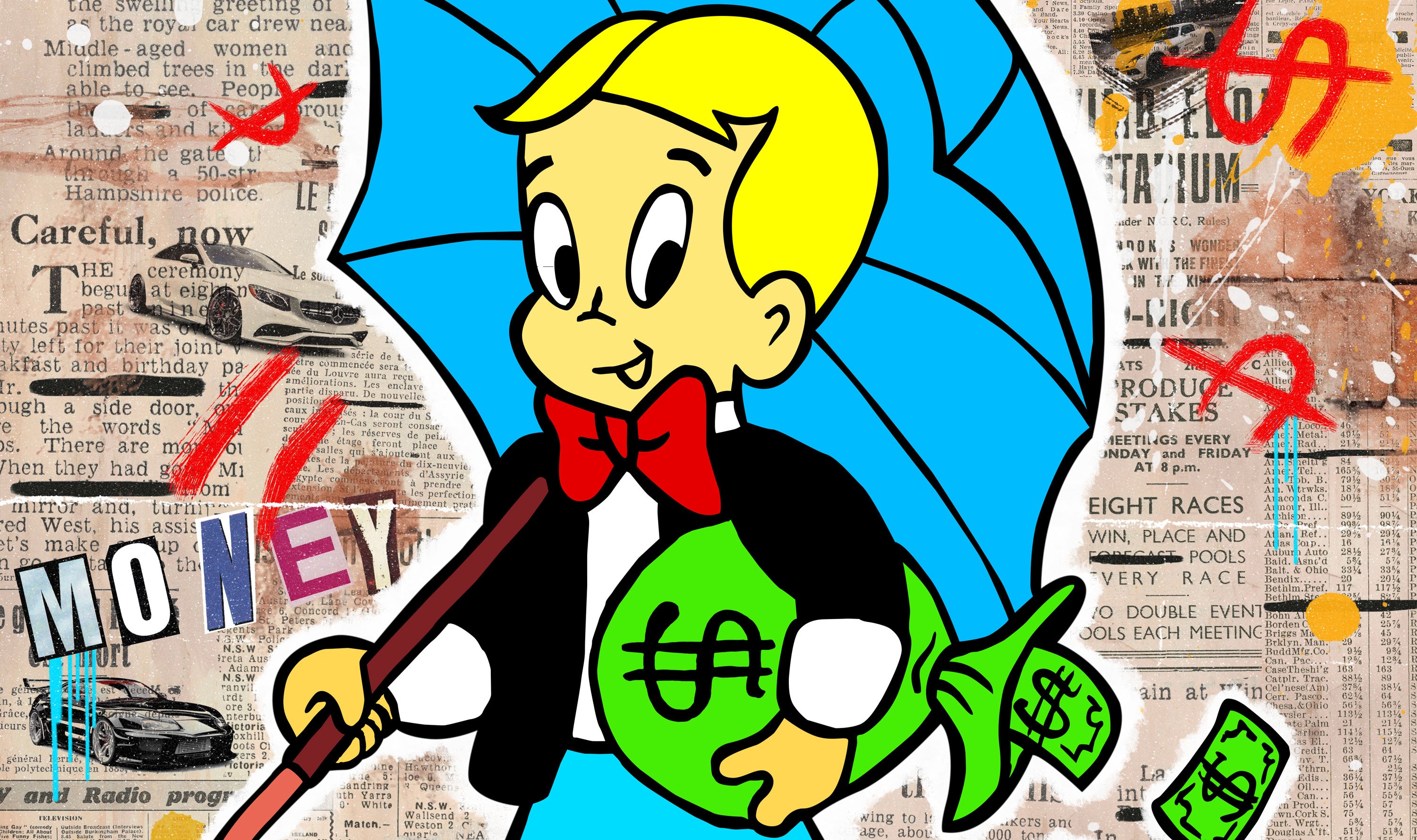 In this work, a familiar cartoon figure—clutching a money bag and shielded by an umbrella—embodies the central tension of the series: once wealth is attained, it must be protected. Through vibrant colors and layered media, the piece highlights the burden of success and the fragility of comfort in a consumer-driven world.