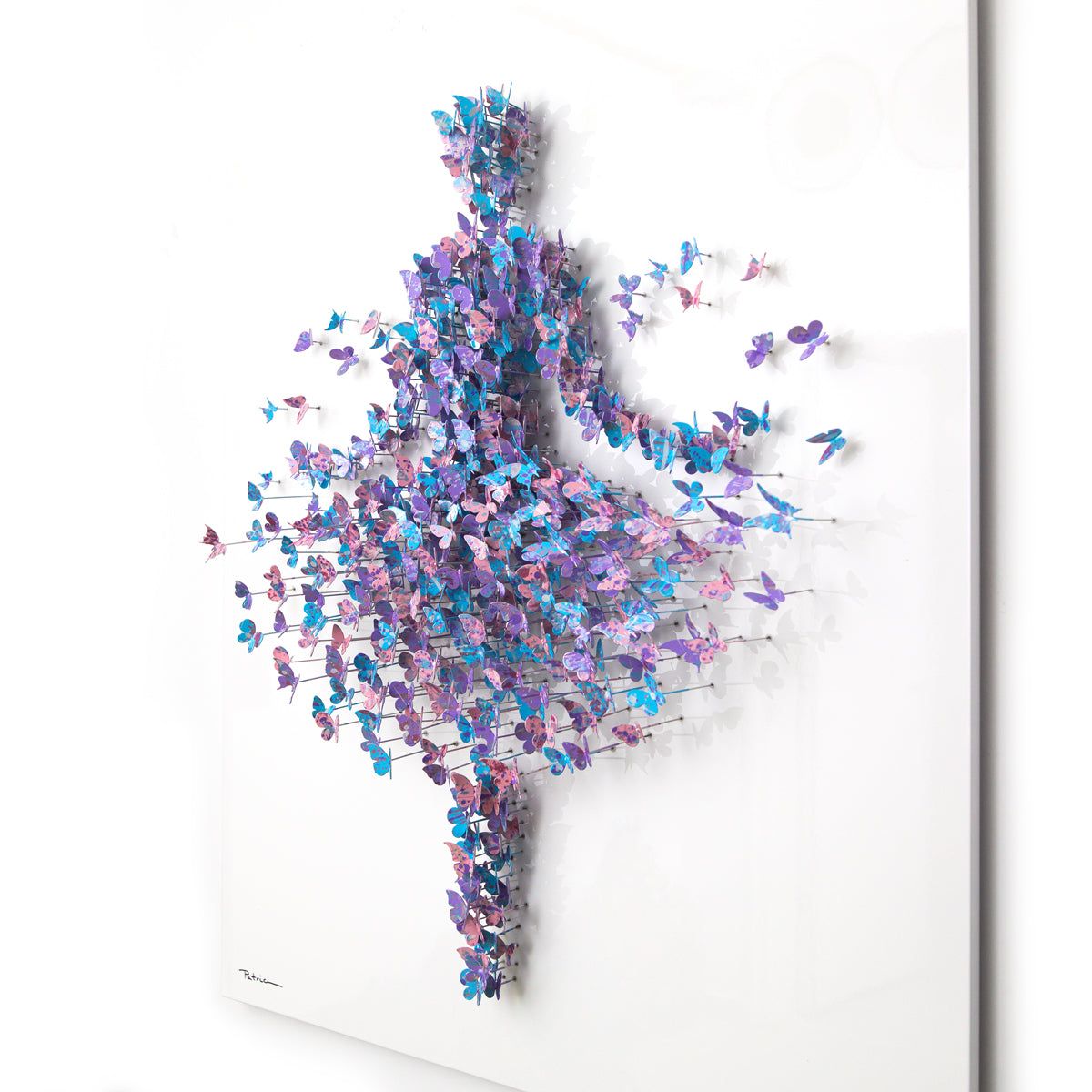 “Ballerina” is a striking three-dimensional mixed-media work by acclaimed contemporary artist Patricia Govezensky, celebrated for her vibrant palettes and expressive female figures. Hand-crafted using layered cut-metal elements over sculpted wood, the piece creates depth, movement, and a captivating interplay of texture and color.