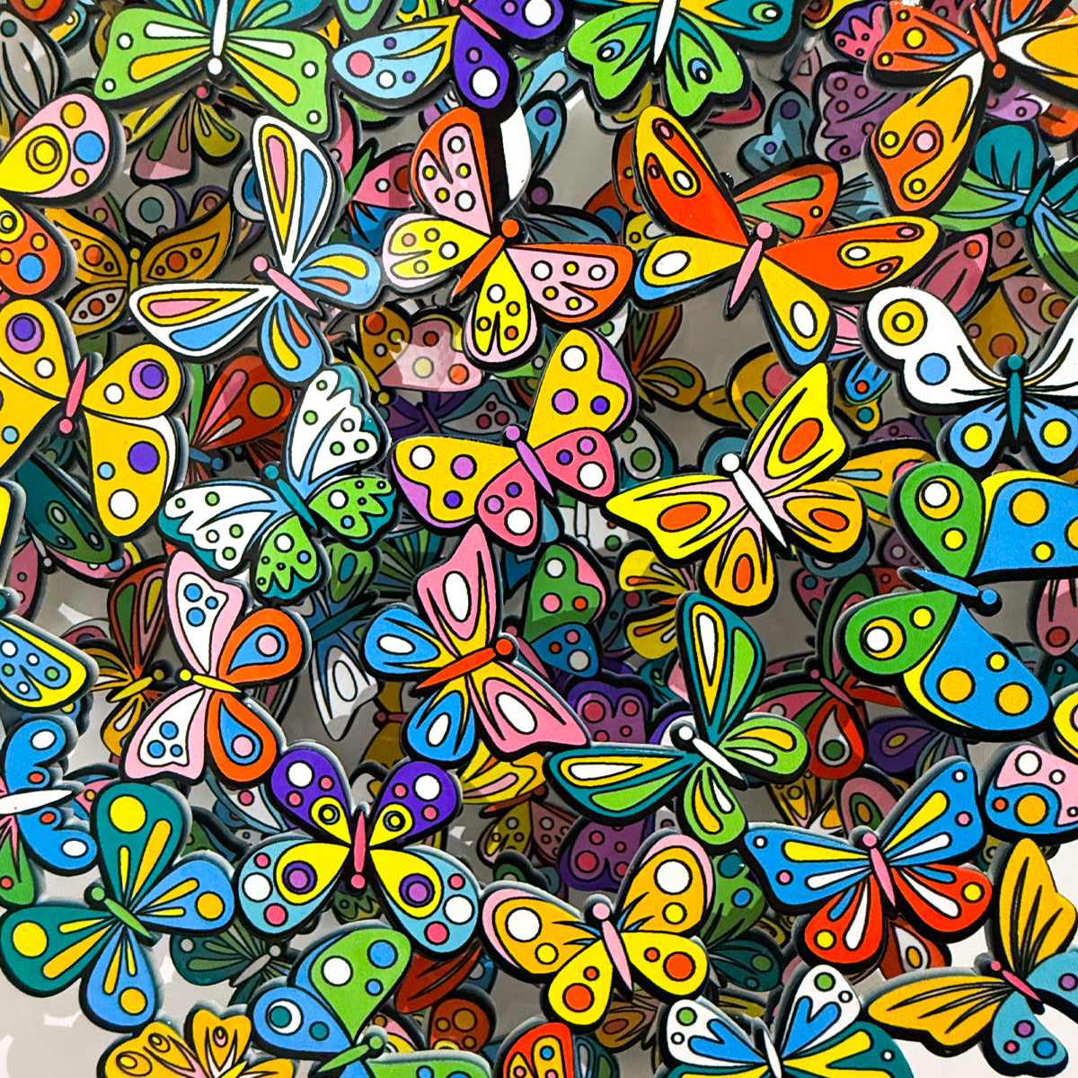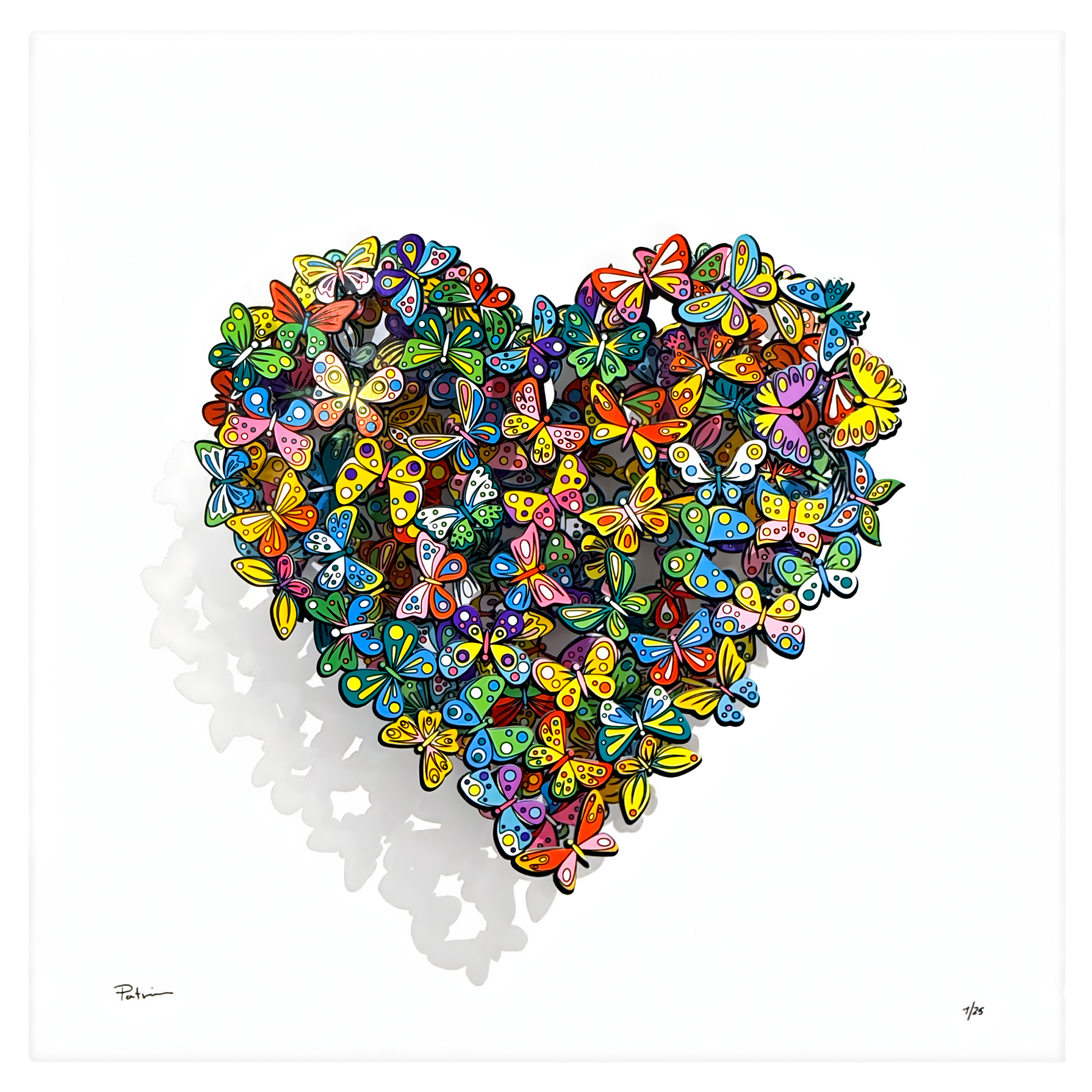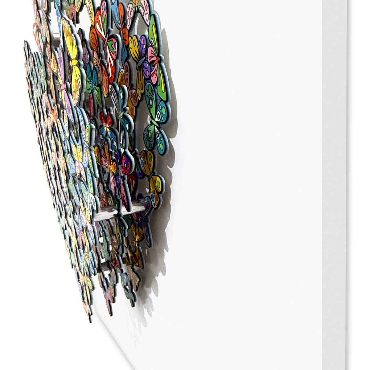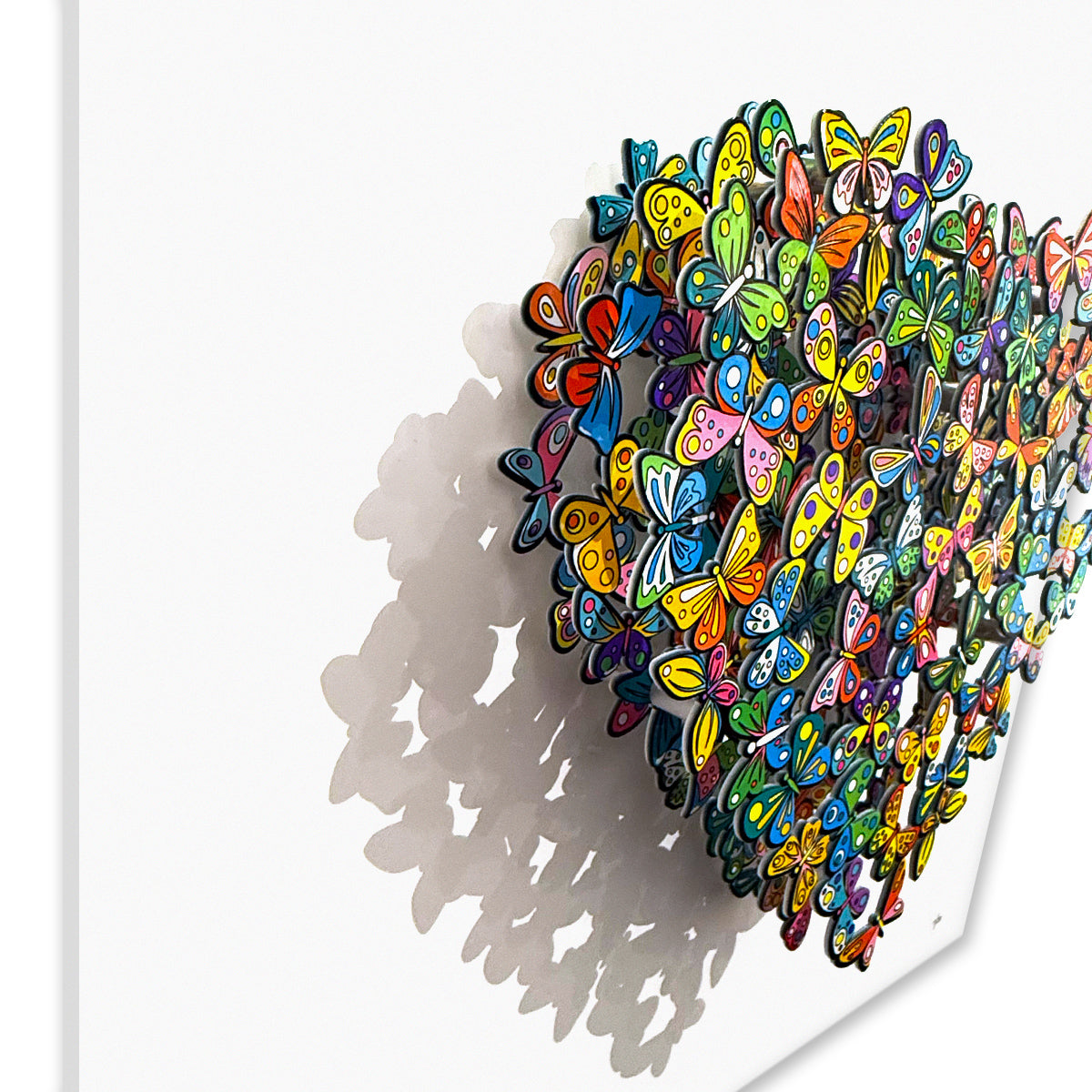 A mixed-media three-layer cutout metal sculpture integrated with sculpted wood, this work forms a radiant heart composed of vibrant butterfly motifs. The interplay between the precision-cut metal and the sculpted wooden element adds depth, structure, and elegant dimensionality, while the layered construction creates dynamic shadows that enliven the composition. Rich color and refined detailing give the piece a joyful, uplifting presence that embodies its title.