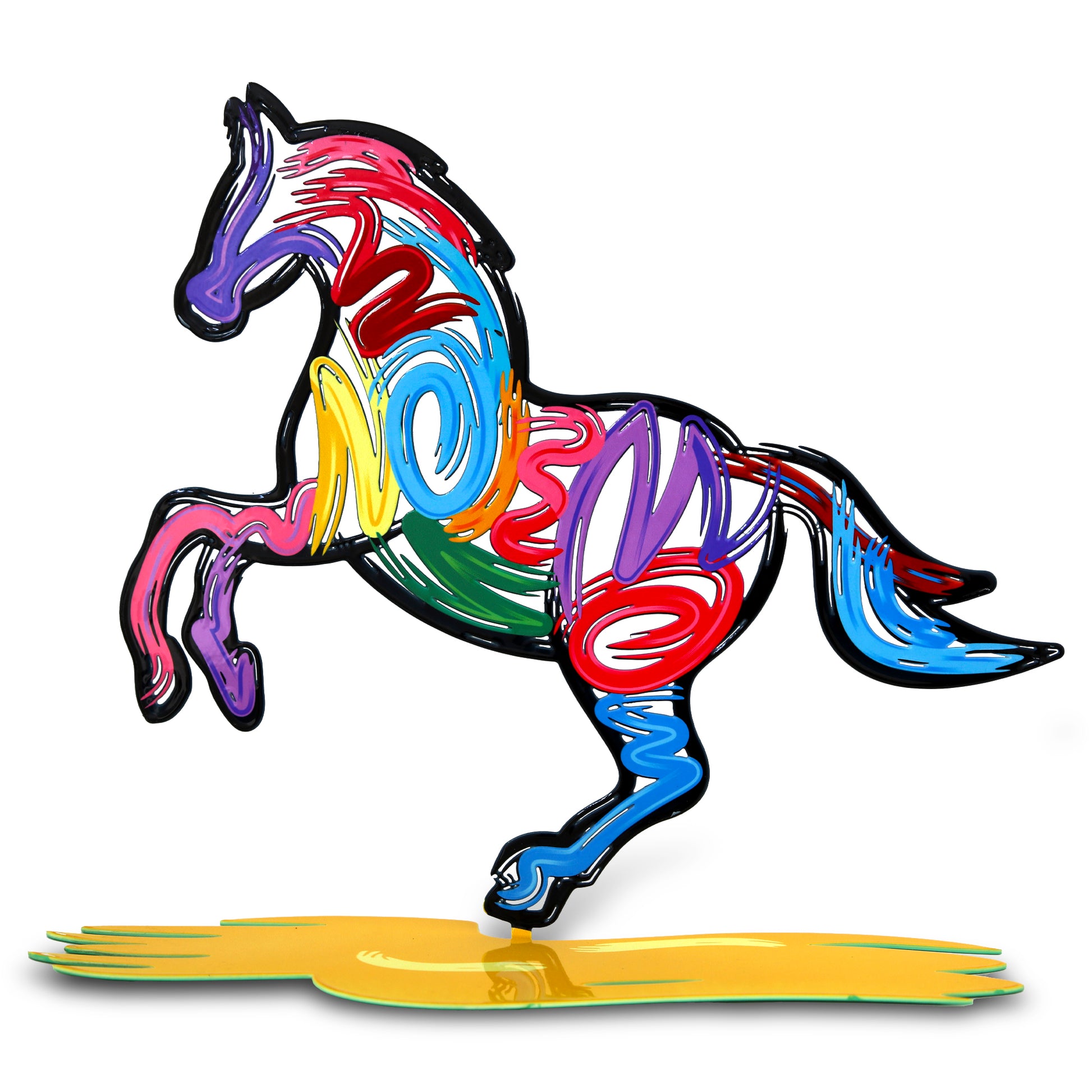 This vibrant steel sculpture captures a rearing horse in mid-motion, rendered in Patricia Govezensky’s signature bold colors and flowing lines. The dynamic pose and swirling patterns convey strength, freedom, and energy, transforming the powerful form of the horse into a joyful contemporary sculptural statement.