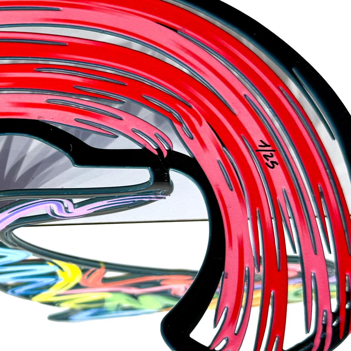 Mixed-media, double-sided sculpture depicting a stylized dolphin in mid-leap, outlined in bold black contours and filled with expressive multicolor splash-style brushstrokes. The dynamic form and glossy finish create a sense of motion as the figure rises above swirling blue waves. Limited edition of 25.